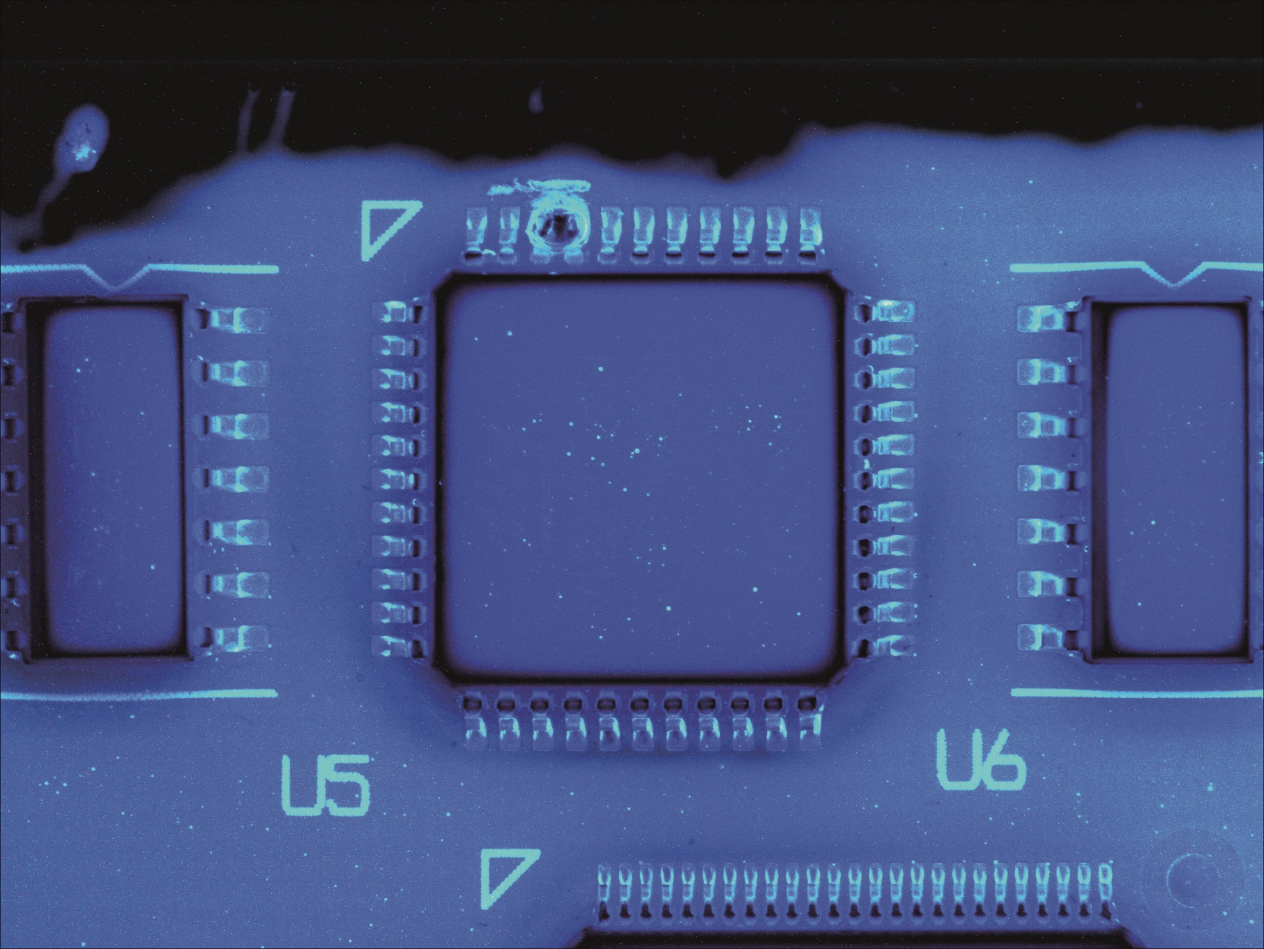 The inspection process uses white light and special UV LEDs which reliably reveal defects in UV-sensitive conformal coating. The S3088 CCI's flexible inspection algorithms can be rapidly adapted to various conformal coatings. Optimal inspection coverage is ensured by means of one orthogonal camera in combination with four, or optional eight, angled view cameras, which allow for accurate inspection of component sides and gaps between pins. With a maximum orthogonal resolution of up to 15 μm/pixel and an angled view resolution of up to 17.5 μm/pixel, the S3088 CCI inspects all typical defects with 100% reliability — and thanks to the standard four, or optional eight, side views, inspection results are free of shadowing. Special high-powered LEDs are used for the inspection of poorly reflecting coatings, such as conformal coatings which are very thin or coatings which contain silicone. The system also provides layer thickness measurement (3D spot measurement), nanolayer inspection and wet coating inspection. Additional inspection of selected post-reflow criteria, such as OCR and displacement, is also available.