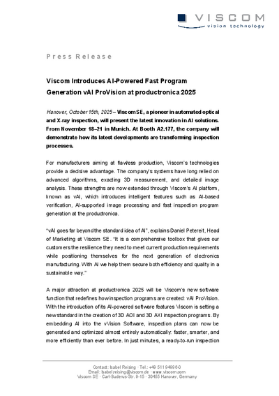 “vAI goes far beyond the standard idea of AI”, explains Daniel Petereit, Head of Marketing at Viscom SE. “It is a comprehensive toolbox that gives our customers the resilience they need to meet current production requirements while positioning themselves for the next generation of electronics manufacturing. With AI we help them secure both efficiency and quality in a sustainable way.”